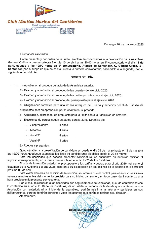 1.- Aprobación si procede del acta de la Asamblea anterior. 2.- Examen y aprobación si procede, de las cuentas del ejercicio 2025. 3.- Examen y aprobación si procede, de las tarifas y cuotas para el ejercicio 2026. 4.- Examen y aprobación si procede, del presupuesto para el ejercicio 2026. 5.- Obligaciones formales para uso de los atraques del Puerto y servicios del Club. Estudio de propuestas para su aprobación por la Asamblea, si procede. 6.- Aprobación, si procede, de propuesta para la limitación a la trasmisión de amarres. 7.- Elecciones de cargos según estatutos para la Junta Directiva de: - Vicepresidente 4 años - Tesorero 4 años - Vocal 2º 4 años - Vocal 4º 4 años 8.- Ruegos y preguntas. Quedará abierta la presentación de candidaturas desde el día 03 de marzo hasta el 12 de marzo a las 19:00 horas, quedando expuestas las listas de candidaturas elegibles desde el 20 de marzo. Para los asociados que deseen presentar candidatura, se encuentra en nuestras oficinas el impreso correspondiente, en la forma que se cita en el artículo 25 de los Estatutos. El acta de la reunión anterior, el presupuesto y las tarifas y cuotas para el año 2026, así como el dictamen de la Auditoria del año 2025, estarán a su disposición en las oficinas de la Asociación a partir del próximo 06 de abril. Para evitar demoras en el inicio de la reunión, se informa que el control para el acceso se iniciará sesenta minutos antes del momento previsto para su inicio. La reunión, en todo caso, dará comienzo a la hora prevista en la presente convocatoria. Por último, se recuerda a los asociados que seguidamente se relacionan, que, de conformidad con lo contenido en el artículo 16 de los Estatutos, de no saldar el importe de la deuda que mantienen con la Asociación con anterioridad al inicio de la asamblea, podrán asistir a la misma y participar en sus deliberaciones, pero no tendrán derecho a votar los asuntos que serán sometidos a su decisión. Atentamente,